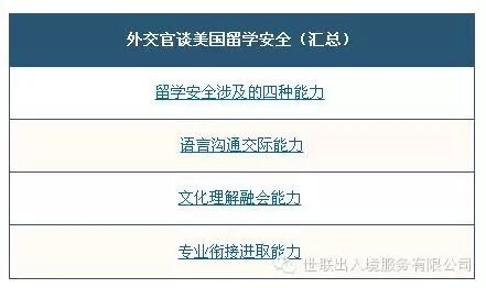 一、出国留学安全所涉及的四种能力,即:1、语言沟通交际能力;2、文化(包括价值取向、宗教信仰)理解融会能力;3、专业衔接进取能力;4、身心承受能力和经济支付能力。
