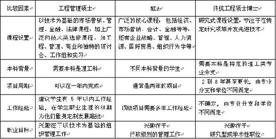 下面是工程管理硕士与MBA,普通工程类硕士博士的比较: