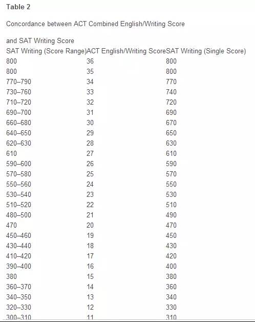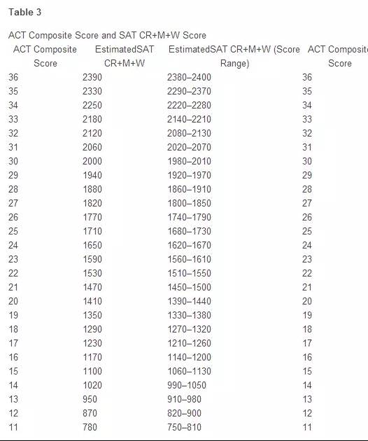 表三(ACT总分)与(SAT阅读+数学+写作总分)的对照: