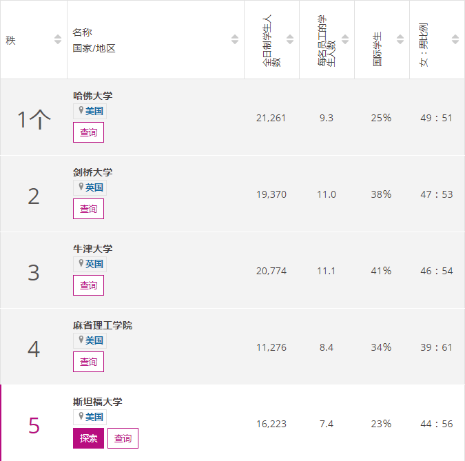 在各榜单中,除了院校名次,我们还可以看到各校的学生人数、师生比例和国际学生占比,这些数据对于我们留学生而言也非常具有参考价值。