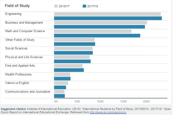 从最新的《门户开放报告》(即Open Doors报告,是由美国教育和文化事务局(ECA)支持、美国国际教育协会(IIE)主办的一个综合信息平台)来看,学习数学及计算机科学领域的国际学生人数为186,003人,相比前一年增长了11.3%,占国际学生总人数的17%,所以国际学生对于就读CS相关专业的认可度依旧很高。