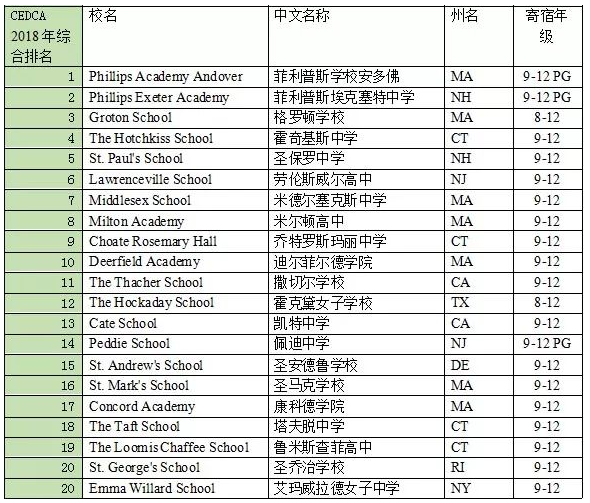 美国私立寄宿高中 哪家强?日前发布的《CEDCA 2018美国私立寄宿高中综合排名》显示,Phillips Academy Andover(菲利普斯学校安多佛) 、Phillips Exeter Academy(菲利普斯埃克塞特中学) 、Groton School(格罗顿学校)名列前三名。