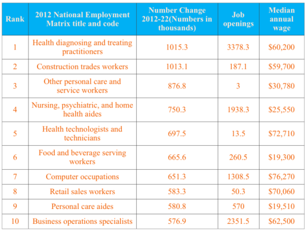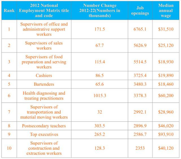 美国劳动统计局有一份类似于“十年计划”的项目,被称为 Employment Projections program。这份调查数据以NAICS(North American Industry Classification System)的行业分类为标准,提供2012年的就业市场情况以及2022年预期达到的就业市场情况。