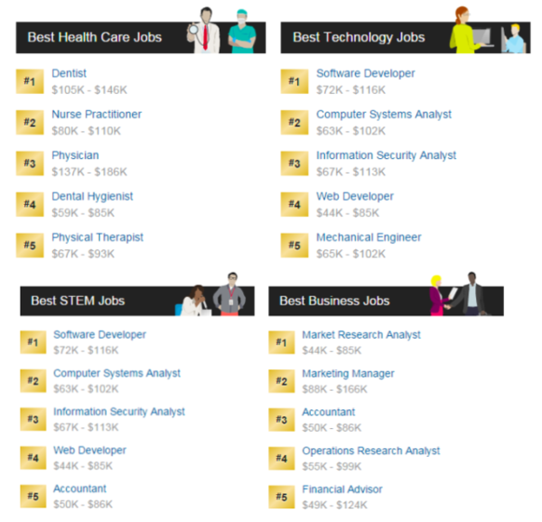 U.S. News总结了2015年最优职业的排行榜,评分考虑了10年增长总量(10%)、10年增长率(10%)、工资中位数(30%)、就业前景(20%)、就业率(20%)、压力程度(5%)和工作与生活平衡(5%)七大因素,并且各有权重(权重在括号中显示)。总榜单中的前十名如下: