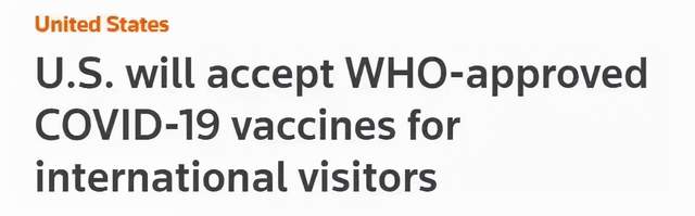 其中就包括:中国国药和北京科兴。白宫表示:飞往美国的外国公民,在登机前出示3天内核酸阴性检测报告和全面接种疫苗证明,就可以入境美国。
