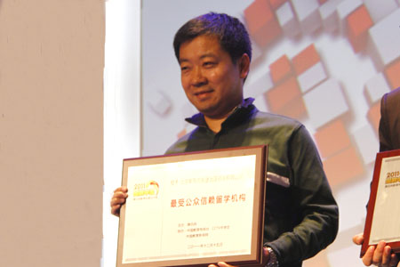 2011“回响中国”腾讯网教育盛典以“总有一种力量推动教育前行”为主题,盘点年度以不懈的点滴行动打破现实教育坚冰的微力量,致敬一年来在教育领域中做出杰出贡献的榜样。本次活动历经网友一个月时间的投票,并结合专家评审团的意见,最终产生的“2011中国教育产业价值榜”于盛典上公布。该榜单共19个奖项,覆盖教育行业的各个领域。其中,年度中国教育企业杰出领袖授予了新东方教育科技集团执行总裁陈向东等人,在其余各个教育细分领域中,新东方教育科技集团及其下属机构均获嘉奖。近年留学风起云涌,留学中介机构的业务能力和公信力备受关注,腾讯教育总评榜专门设立最受公众信赖留学机构榜单,新东方前途出国咨询有限公司以其“专业、负责、贴心、权威”的服务赢得网友和专家信赖,再次捧回大奖。