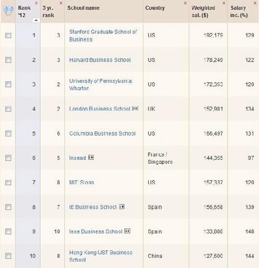 在2012年全球MBA百强排行榜,斯坦福大学商学院荣登榜首,其它前5名分别是哈佛商学院,宾夕法尼亚大学沃顿商学院,伦敦商学院和哥伦比亚商学院。