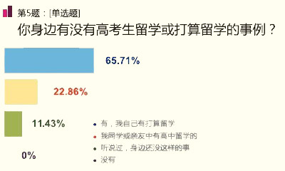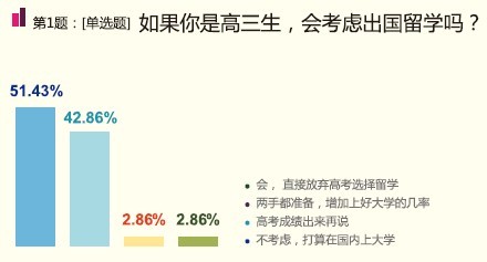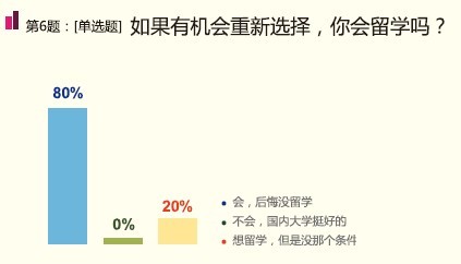已经成功挤过高考独木桥升入国内大学的“胜利者”是否满意自己的现状?是否对当初的选择依然坚定?针对高考过来人——本科在读生和已毕业工作人士,我们设置了“重新选择”的机会。有意思的是,100%的调查参与者都选择了留学,其中80%后悔没有留学,20%表示虽然想留学可没资金条件,没有一位选择“国内大学挺好的”。