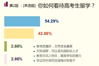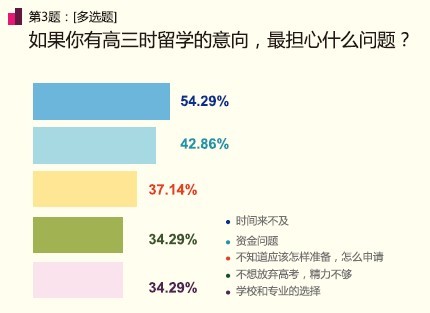 在“高考和留学如何选择”的问题上,一半以上的网友选择了直接弃考留学,4成多选择两手都准备,并且近9成调查参与者已经打算留学或者身边同学亲友已经留学,只有2.86%的网友表示不考虑留学。在如何看待高考生留学的问题上,7成多同学认为这是明智之举,可以选择更好的大学;1成多同学认为是由于高考竞争太激烈导致,但同时,一半以上的同学最担心高考留学时间来不及,其次是不知道如何准备和申请,资金问题以及海外院校专业的选择也是普遍担心的问题。这反映出大部分的高中生具有强烈的留学意向,主动选择留学并非为了逃避高考的压力,而是追求更优质的教育,但对留学准备申请事宜却没有清晰的认识,呈现“心有余而力不足”的特点,缺乏合理的留学规划,因此相关专家的指导对于有留学意向的高考生来说显得很重要并且必要。