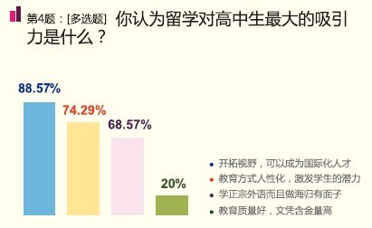 为何中国学生属意留学?在“留学吸引力”的多选题中,高达88%的调查参与者认为留学能够开阔视野,成为国际化人才,紧随其后的是对国外人性化教育方式的认可,近7成认为国外大学的教育质量更好,文凭含金量更高。可见,中国学生热衷留学更多的是出于提升自身发展潜力的目的,以及对人性化、高质量教育的渴望。