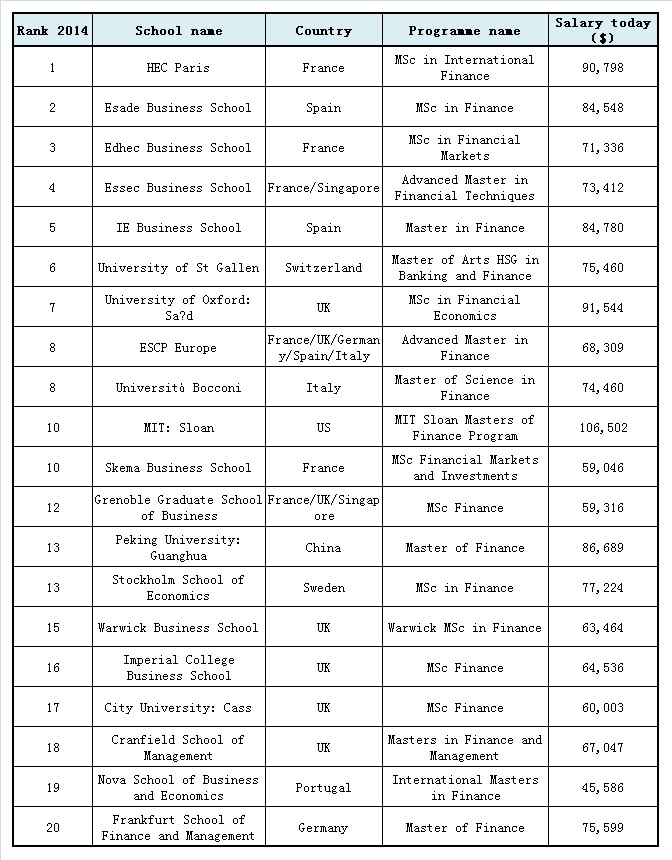 日前,英国《金融时报》集团(Financial Times Group,简称FT)对外公布了“2014年金融硕士排行榜”,对于热衷赴海外留学金融专业的中国学生而言,这无疑提供了最为有效的参考依据!