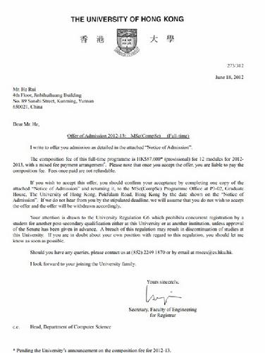 在我和文书的努力之下,和同学在5月底成功获得了香港大学计算机专业的录取通知书。总结,在校成绩固然非常重要,但如果学生在课外活动实践及其工作经验方面有所优秀表现,专业有独特的见解,有科研方面的成果,即使申请时间稍微晚一些,GPA不够高,同样有机会可以走进世界顶尖名校之门。