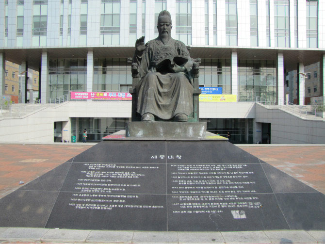 在仁川大学校园里,有一尊高大的塑像,这个人就是韩国文字的发明人——李祹。