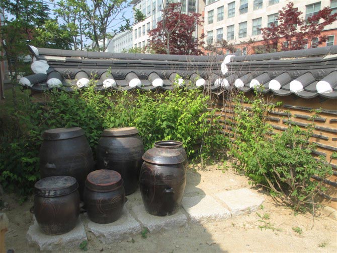 在仁川大学校园里看到的,富有韩国风情的民宅及景观一角,摆放着许多的泡菜坛。