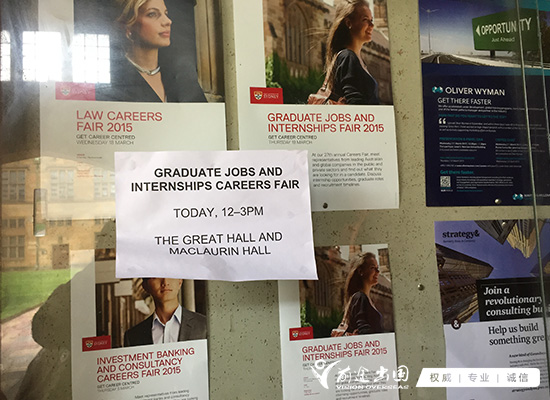 穿过走廊,听到这样一段对话: 一位家长带着孩子问,悉尼大学毕业以后好就业么?我抬头开了一下这位被问的女生,她自信从容的笑了笑,先不说好不好找工作,最起码学校会给你提供很多机会去面试,去实习,去完成你想做的事情。顺着她手指的地方,我拍下了这样的一张图片,忍不住下来与大家分享: