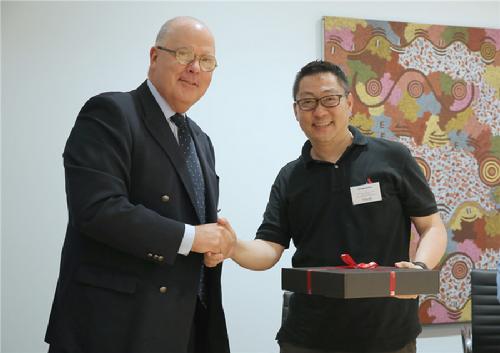 麦考瑞大学校长S Bruce Dowton 与周成刚老师互赠礼物