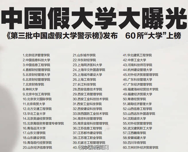 《第三批中国虚假大学警示榜》近日发布,60所“李鬼大学”榜上有名,涉及全国19个省市,主要集中在高校众多的城市。包括北京15所,山东、上海和陕西各6所,江苏5所,河北3所……
