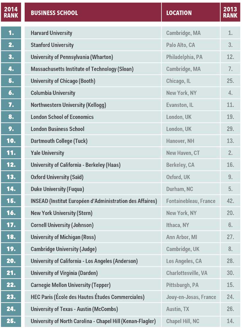从榜单中可以看出,排名前25的世界商学院中绝大多数位于美国。当然,也有其他国际商学院名次领先。诸如排名第8的伦敦政治经济学院、排名第9的伦敦商学院及为别位列第13和第15的牛津大学和欧洲工商管理学院。