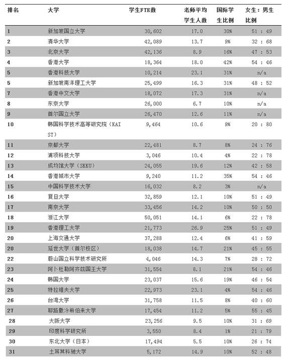 本次大学排名前十中,中国高校占据五席,除了清华、北大之外,香港大学位列第四,香港科技大学和南洋理工大学并列第五,香港中文大学则排在第七位。第八至第十位的高校分别是东京大学、首尔大学和韩国科学技术院。