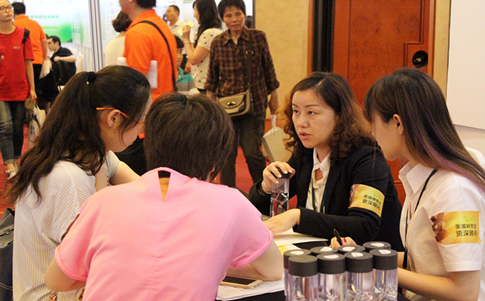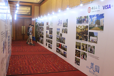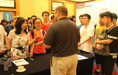 学生在展会现场认真倾听海外留学生现身说法