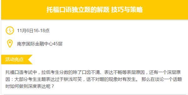口语不好是什么样的体验?在国外连吐槽都不顺溜,惨绝人寰的托福口语分数求别提好么!!!!那么,留学生应该怎样快速提高自己的口语水平呢?靠外教,土豪VIP或者国外男/女朋友?这些都不靠谱。最重要的,是要有坚定不移的信念和敢于努力的决心,再加上一些小的技巧,一个月内托福口语提升到26分不是梦!!!可是,练习口语的时候有什么窍门呢?11月6日16点南京国际金融中心45层让托福口语大神来为你解答。