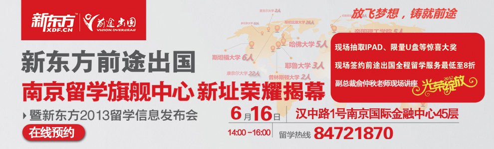 6月16日开业当天,现场签约享受年度最高折扣——英联邦、欧亚国家全程服务费8折,美国全程服务费8.5折,让客户在享受专业顾问、高水准文案服务的同时,更多的分享新东方前途出国新址开业的喜悦,另外,开业当天北京新东方前途出国咨询有限公司副总裁、哥伦比亚大学金融工程硕士、前南京新东方学校校长俞仲秋老师,也针对于2013年留学的最新信息进行发布,针对个别案例进行深入分析,并通过自身近5年华尔街金融工作经验,分析目前留学与海外就业的现状,为现场准备出国留学的准留学生们提供了非常好的建议。 到场有机会抽取IPAD、限量U盘等惊喜大奖,提前预约额外获得《全球留学指南》一本。