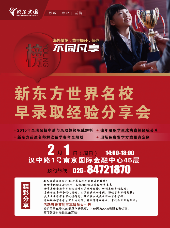 世界名校录取学子亲临现场分享成功经验、回顾名校申请之路;名校梦想导师个性化规划,分享经典成功案例,解读热点国家留学申请最新趋势;众多业内资深专家现场讲座,带来最权威最新鲜的留学资讯;活动现场家长学生可自由交流,结识留学同路人,申请路上不再孤单;活动当天签约可享留学大礼包:签约美国享受3000元服务费优惠,其他国家2000元服务费优惠,并可获赠时尚铁三角耳机!