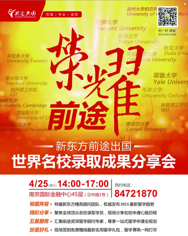 2015年全球学校的录取结果陆续揭晓,在南京新东方前途出国的录取榜单中,多名学子取得了哥伦比亚、麻省理工、宾夕法尼亚、剑桥、牛津、伦敦政经、帝国理工等世界顶尖名校的录取offer。4月25日14:00,由南京前途出国主办的“新东方前途出国世界名校录取成果分享会”将在南京国际金融中心45层举行,届时,活动中将对2015年的最新全球名校录取优秀案例做深入的解读。