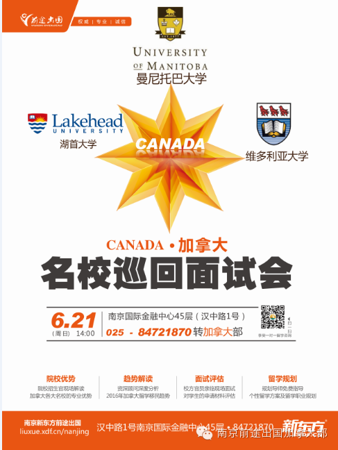 6月21日,加拿大知名院校招生官现场为你解读加国各大名校的专业优势趋势解读,校方官员亲临现场进行面试,海归顾问资深顾问为你深度分析2016加拿大留学移民趋势,南京新东方前途出国留学规划导师为你免费指导个性留学方案及留学职业规划。预约还有精美留学礼包和特色小礼品
