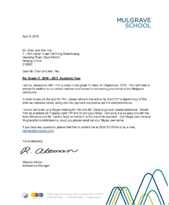 2017年4月,获得Mulgrave的录取信。