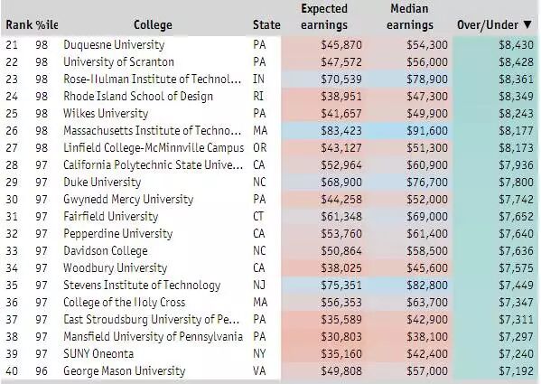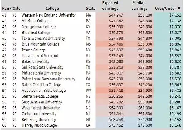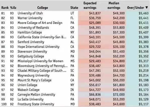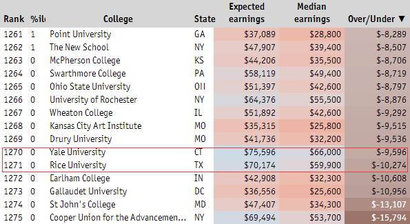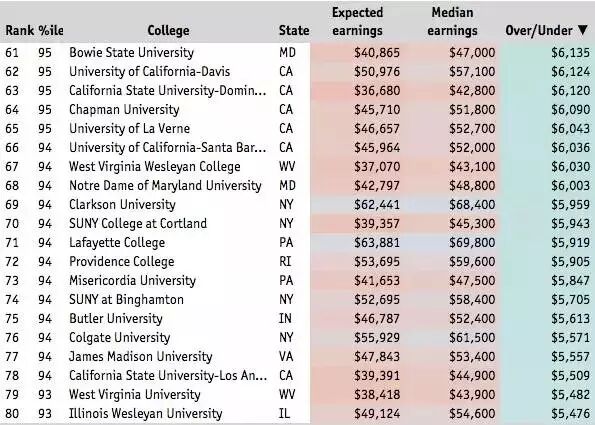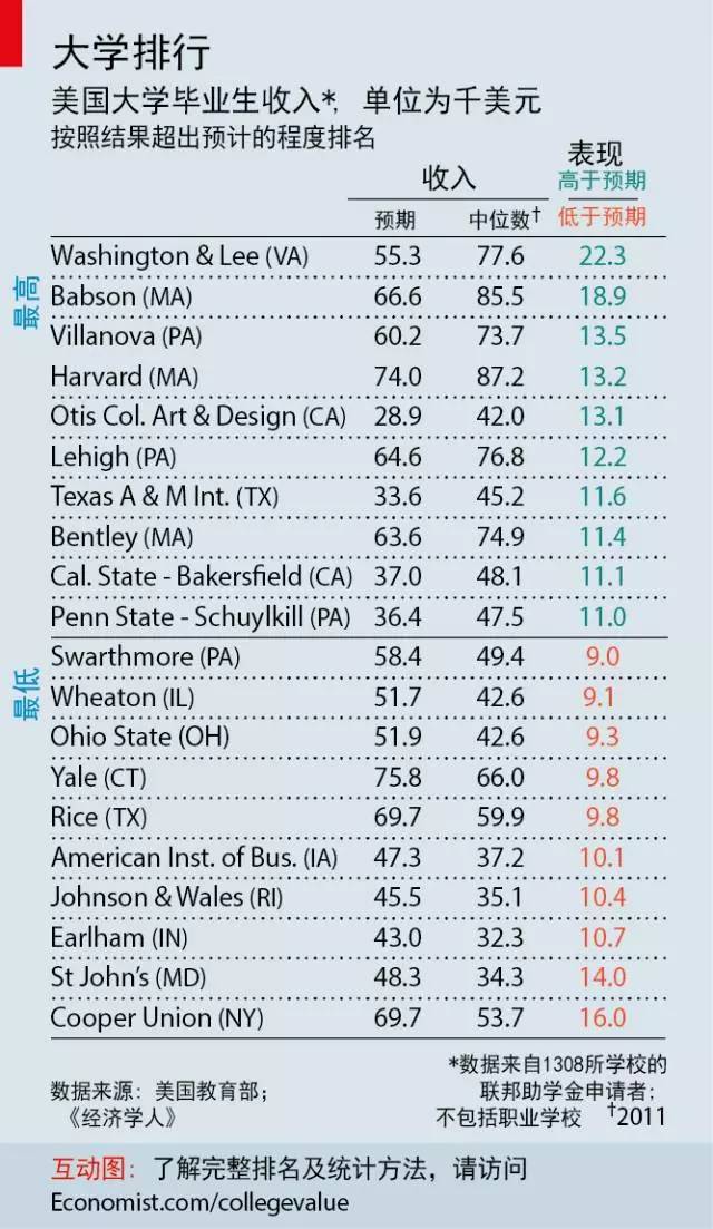 再看一下上面出现的图表,图表中有一栏是预期收入,接着是实际平均收入,最后是相差的额度。《经济学人》正是把实际收入远超预期的放在了名单前列,而那些预期很高但是实际平均收入并没有那么高的学校往下排了,这也是为什么,正如我们所见的,耶鲁大学在1275名学校排名中竟然落在老末的位置。