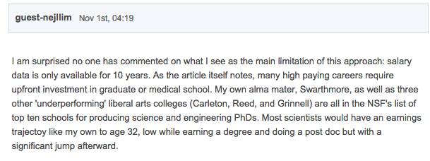 有人直指这份榜单中一个致命的漏洞,《经济学人》所用的收入数据是学生毕业十年后的收入水平。而事实上,许多研究型学科需要学生在本科毕业后继续到研究生院继续学习甚至攻读博士学位,这些学生收入的提升并非立竿见影。这样一来,在本科毕业的早期,的确不少人的收入不甚可观,而往往等到他们30多岁研究有成之后,才得以获得高数额的报酬。▼