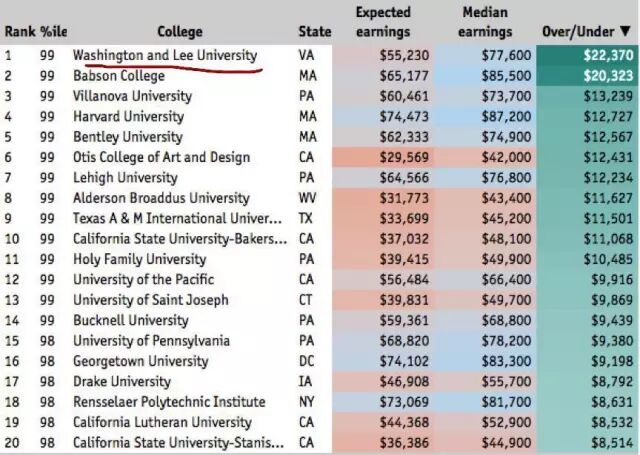而排名第一的华盛顿与李大学(Washington and Lee University)位于位于弗吉尼亚州列克星敦的古老大学,是一所只有两千名学生的文理学院。在去年的U.S News文理学院排名中名列第14位。而本次排名第二的巴布森学院(Babson College)也是一所仅有3000余名学生的私立院校。