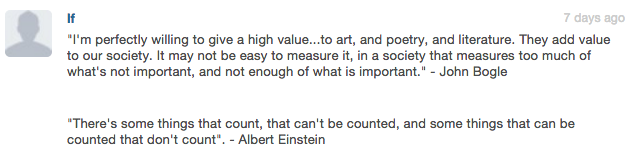 还有人直接引用了英国浪漫主义小说家约翰·伯格(John Bogle)和爱因斯坦的话,用我们自己的话翻译过来就叫:“人生不只有眼前的苟且,还有诗歌和远方。”▼