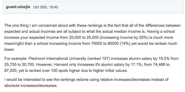 有人指出,即便是拿收入的差距作为衡量标准,这个依据也应该细化。比如,当一个学校学生平均收入从入学的20000美元到进入职场的25000美元,这25%的涨幅甚是可观。但如果考虑另外一所学校,学生收入从70000美元涨到了毕业时的80000,涨幅仅为14%。那这所学校的收入涨幅的意义难道就比前一所要小吗?有待商榷。▼