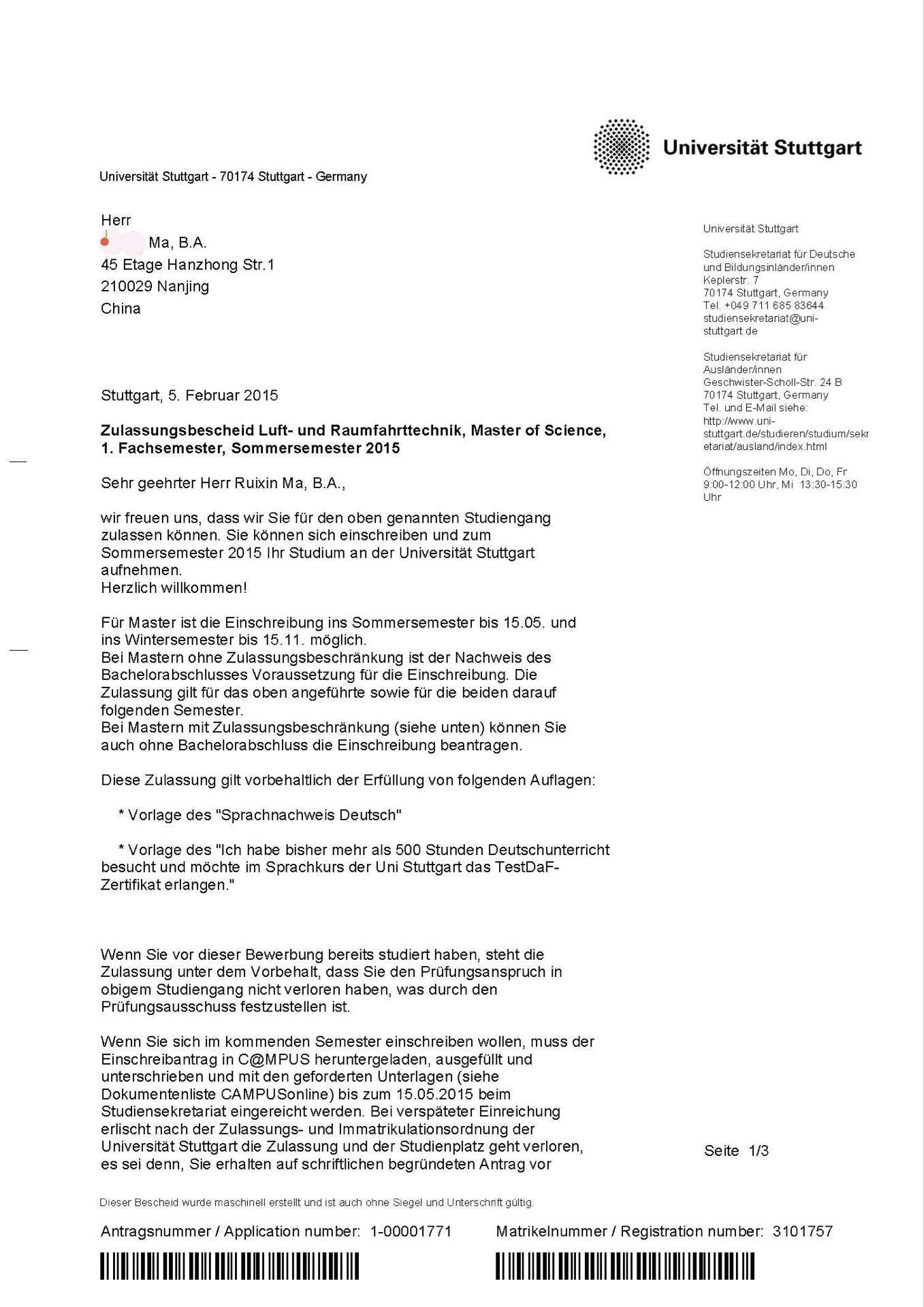这位同学的条件并不是很突出,除了在读学校是个优势。平均成绩偏低,托福成绩一般,德语只有初级水平,也没有实习或者工作经历。所以在选择学校的时候,首先要非常准确地选择可以发预录取,或者是配备语言班的德国大学。这位同学是个自主独立意识强,目标清晰的人,他的理想学校就是斯图加特大学。后期申请过程中,这位同学参与度很高,与文书老师多次面谈申请方案及大学动机信。学生和家长对申请结果很满意。学生如愿进入自己的dream school斯图加特大学的航空与航天技术专业。