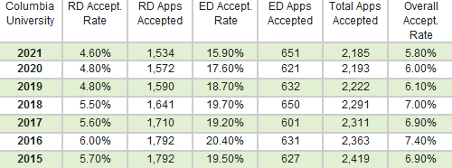 哥伦比亚大学是常春藤大学中较为难以申请的大学,2021届录取中,学校共计收到37,389份录取,而最终只录取了2,185人,实际录取率为5.8%。而哥伦比亚大学ED申请录取率约为常规申请的3倍。
