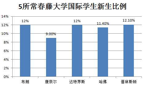 而在国际新生占所有录取学生比例则在12%上下浮动,最高为普林斯顿12.1%,而康奈尔比例最低为9%,但是康奈尔整体录取人数最多。这一比例与之前预计的有很大不同,办学国际化看来是名校所追求的一大目标。