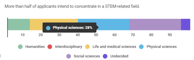 而学生主要学习的科目中,超过一半的学生申请与STEM相关的科目。人文类学科占12%。医学与生命科学占26%,物理占28% 社会科学类占28%,剩余为其他学科。