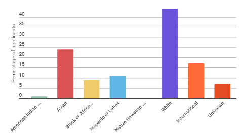 而在所有录取人中11.4%为国际学生。在所有录取学生中15.5%的学生表示对人文学科的学习兴趣,26.5%表明在社会科学的兴趣,而19.3%的人说他们计划学习计算机科学和工程。