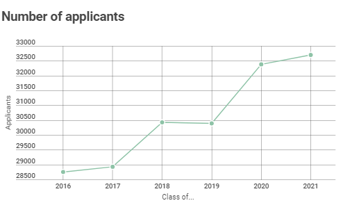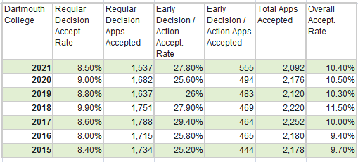 在全部常春藤院校中,达特茅斯的整体录取率为10.4%,仅次于康奈尔。而达特茅斯学院在所有常春藤院校中拥有最高比例的ED录取率,27.8%,而达特茅斯的常规录取率只有8.5%。在2021届录取中,该院校共计录取2,092学生,仅仅多于哈佛与普林斯顿。