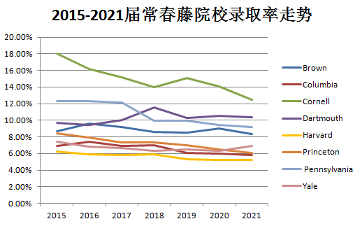 在2015-2021届这6年中,常春藤院校录取率集中在6%-12%上下,但是主要录取率走势呈现下滑趋势。在今年除去耶鲁大学外,其他常春藤院校录取率均呈下降趋势,或者与去年持平。