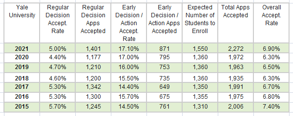耶鲁大学录取率长期在6%上下徘徊,今年是耶鲁大学录取率较低的一年为6.9%,2021届耶鲁共计收到申请32,900份,而实际录取2,272人,ED录取率为17.1%,为常规录取的3倍多。