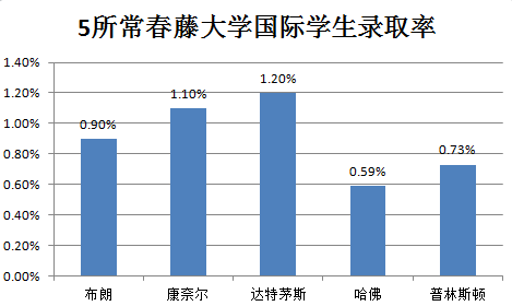在公布国际学生录取率的5所常春藤学校中,录取率在1%前后浮动,最高为达特茅斯1.2%,最低为哈佛0.59%。可见对于国际学生来说,常春藤大学竞争情况异常激烈。
