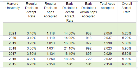 哈佛大学是常春藤大学中录取率最低的大学,2021届学生录取率只有5.2%,2021届共有39,506申请哈佛大学,而最后只有2,056名学生被录取,哈佛大学ED录取率为14.5%,约为常规申请的4倍。而且以ED方式申请哈佛大学的学生比去年上涨5%。
