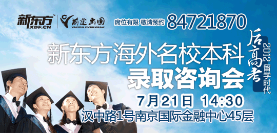 7月21日,新东方将联手世界名校海归顾问团,为中国学生家长奉献一场高考后留学指南讲座。很多国外大学不要求高考成绩,只要求提供高中三年的学习成绩和高中毕业证就可以申请大学。如果你既被国内的大学录取又被国外的大学录取,你可以双向选择到底去哪里就读。