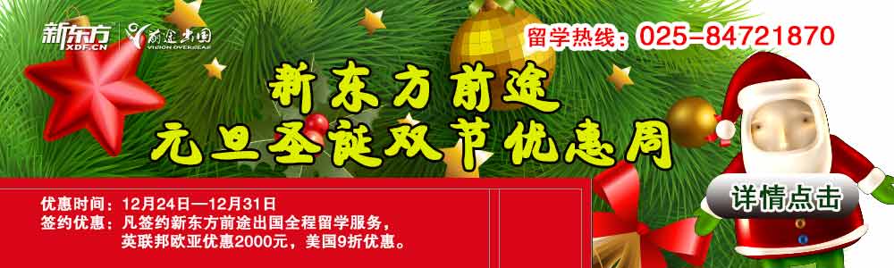 优惠时间:12月24日—12月31日签约优惠:凡签约新东方前途出国全程留学服务,英联邦欧亚优惠2000元,美国九折优惠。详询:025-84721870