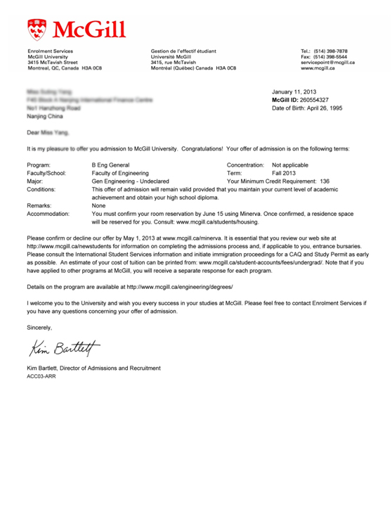 申请结果:麦吉尔大学在申请递出15天便给出了OFFER