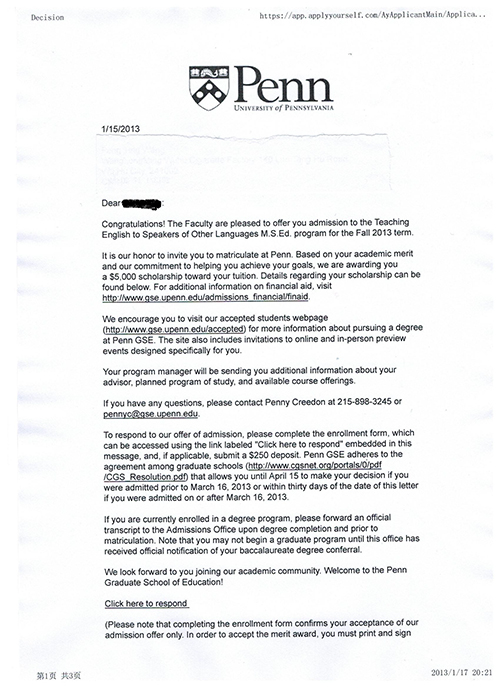 录取院校:宾大 奖学金5K录取时间:2013年1月