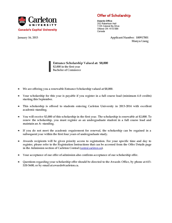 录取结果:卡尔顿大学录取,奖学金8000加币